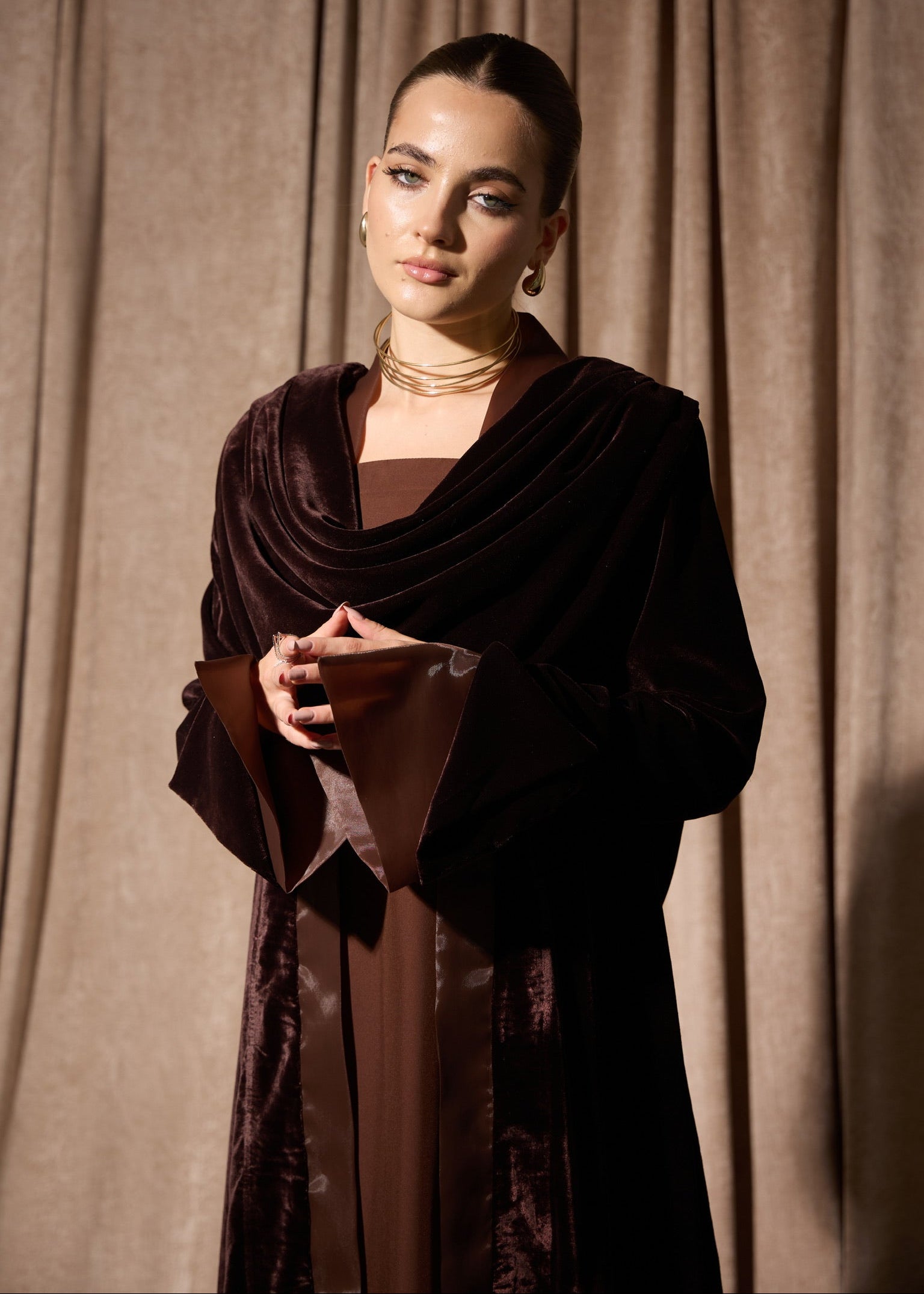 Effortlessly elegant with intricate beaded artwork that catches the light with every movement. The double-draped design creates a flattering silhouette while the warm mocha hue complements all skin tones beautifully. Lightweight enough for comfortable wear throughout long Ramadan evenings, yet detailed enough to turn heads. The beaded finishing adds that perfect touch of sparkle for festive occasions.