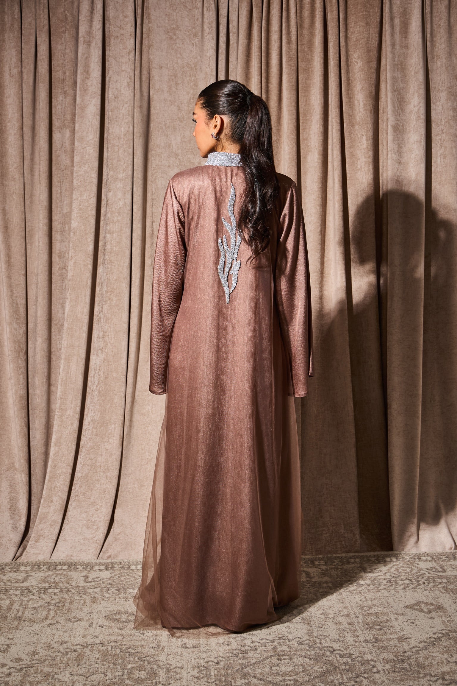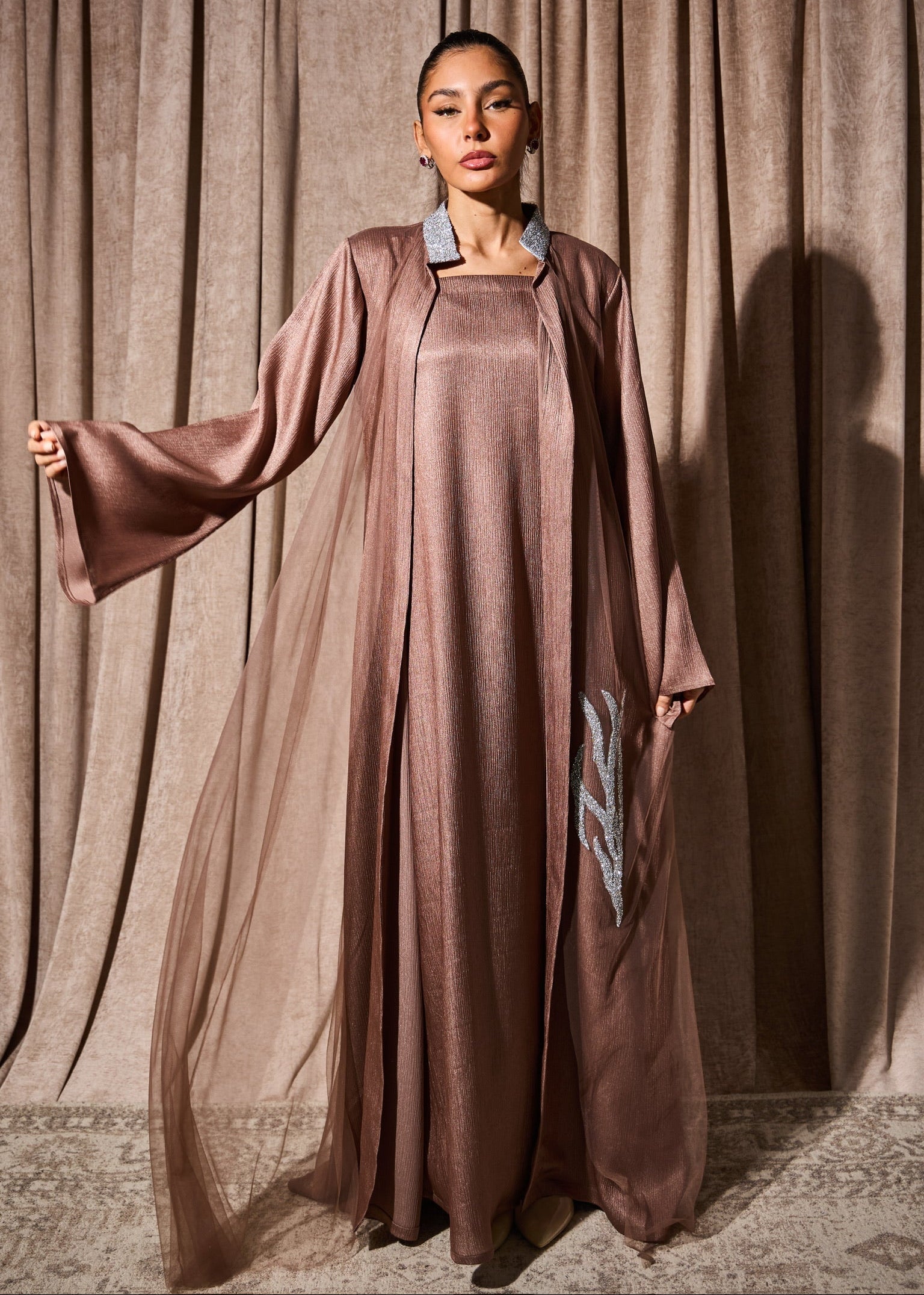 All the elegance of the classic bisht set, elevated with crystal embellishments that sparkle under the lights. This two-piece ensemble pairs tradition with glamour, making it ideal for your most special Ramadan occasions. The crystals catch the light beautifully during evening gatherings, adding celebration to every moment. Perfect for Eid preparations or memorable ghabgas.