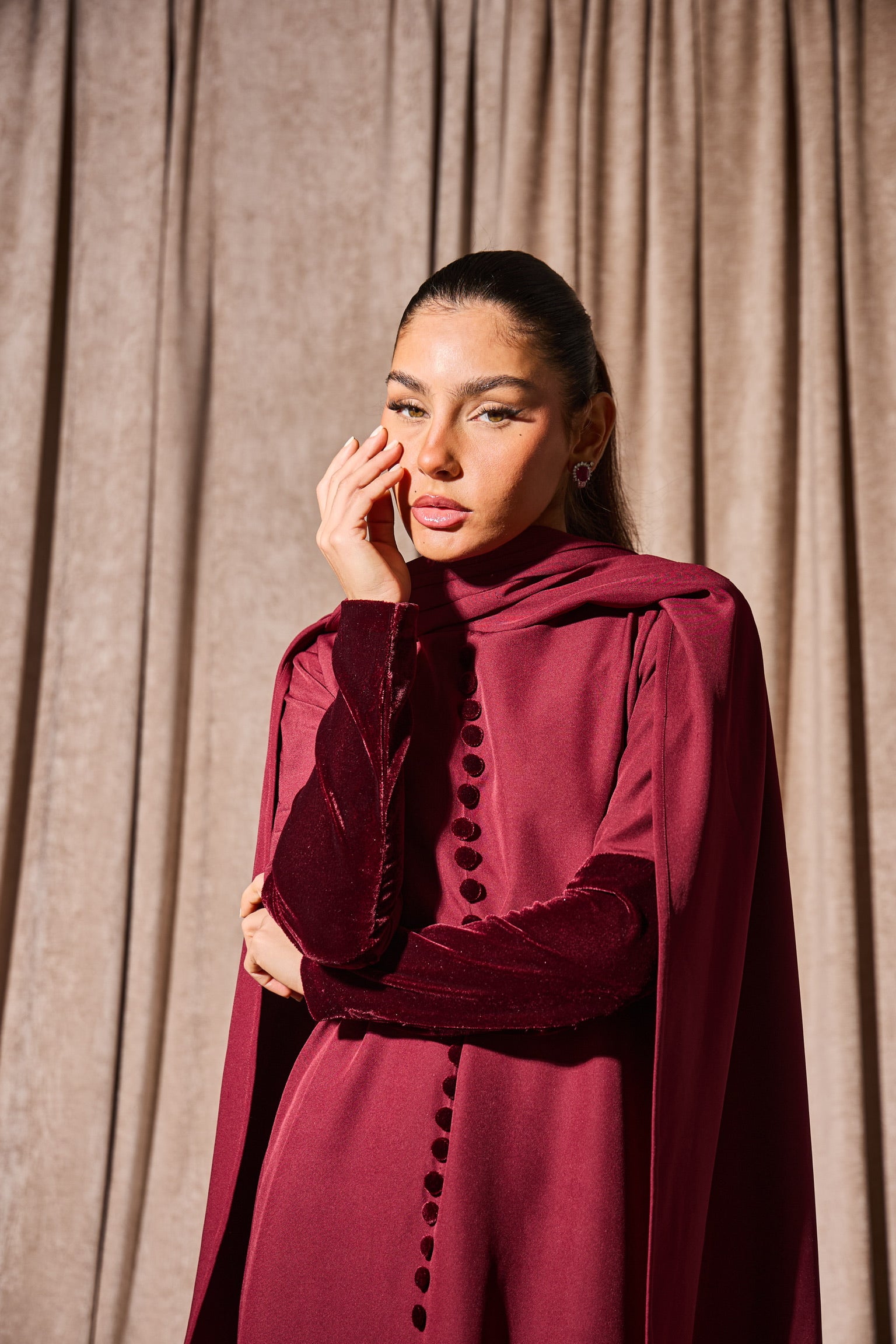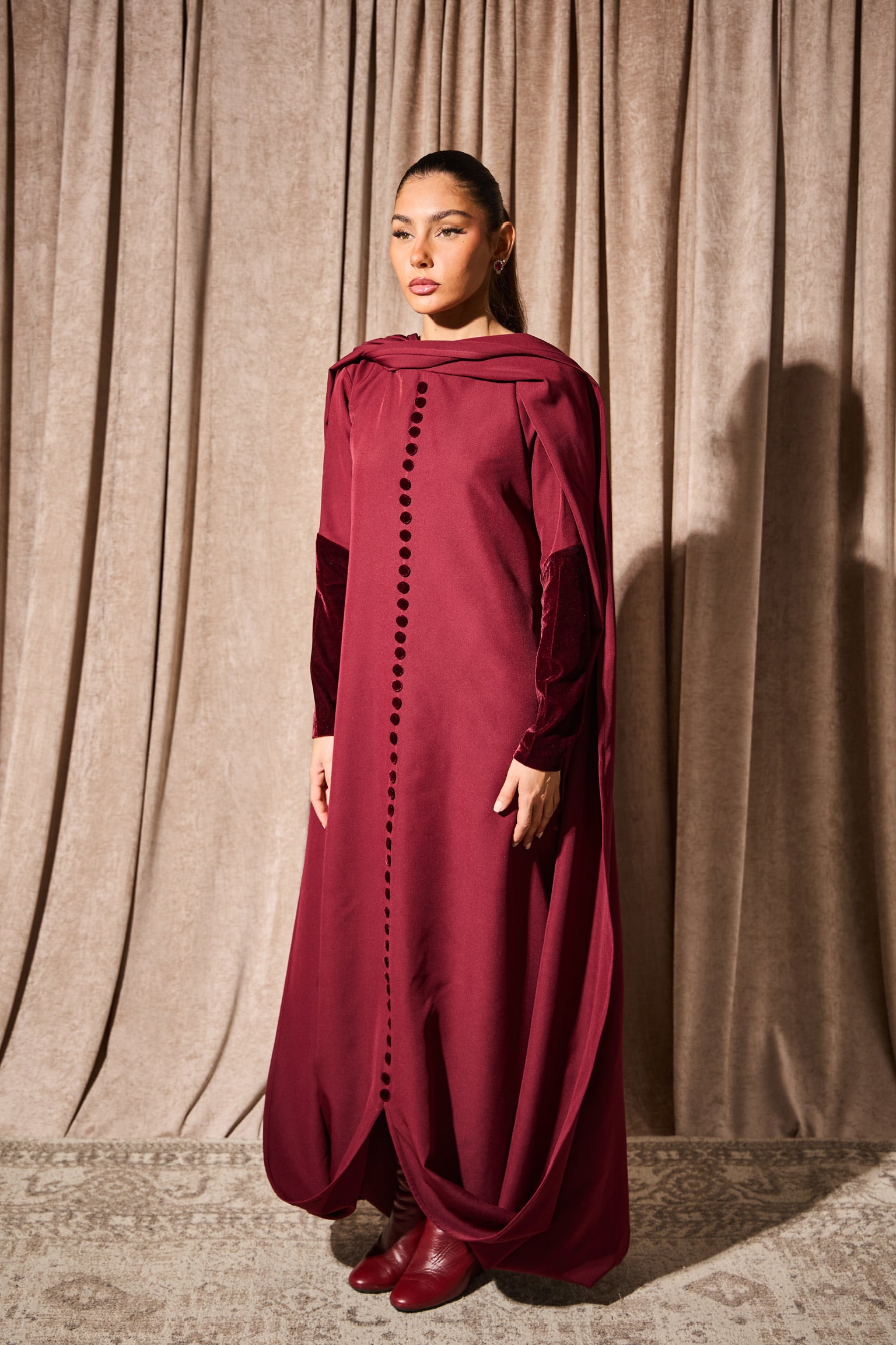 Regal by name, regal by nature. The Empress in deep burgundy is designed for the woman who leads with confidence. This rich, wine-toned piece adds sophistication to any gathering and photographs beautifully. The structured design ensures you look polished from iftar to suhoor. Also available in classic black for those who prefer timeless elegance.